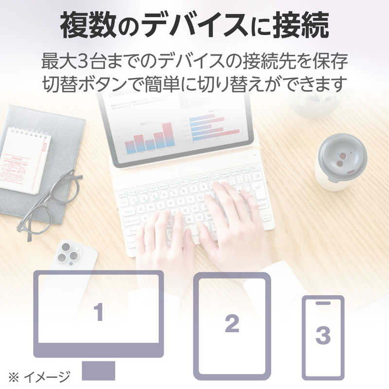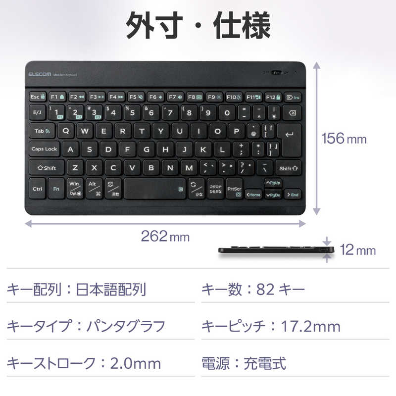 キーレイアウト:日本語82 キースイッチ:パンタグラフ インターフェイス:Bluetooth テンキー:なし(テンキーレス) キーストローク:2.0mm
