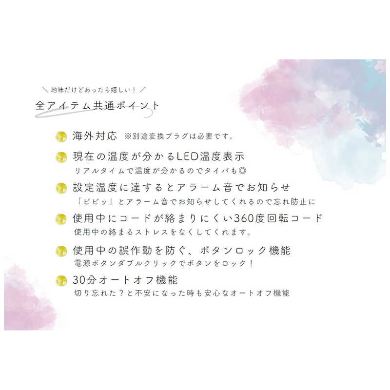 アイロンタイプ:ブラシ アイロン温度(温度調節段階):100℃~200℃(11段階) 電源自動OFF:○ マイナスイオン:○ 海外対応:○ 重量:約354g