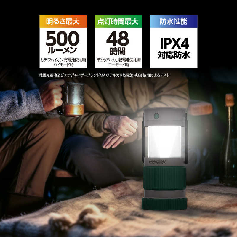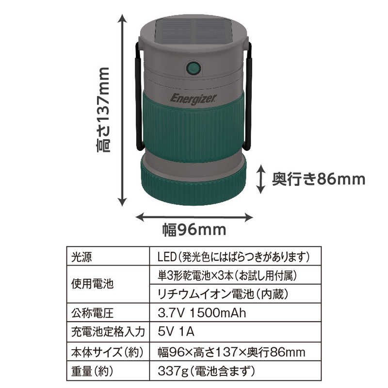 タイプ:LEDランタン 燃料・電源:単3形乾電池×3本/リチウムイオン電池(内蔵)3.7V 1500mAh、ソーラー充電 明るさ:500ルーメン 連続点灯時間:2.5時間